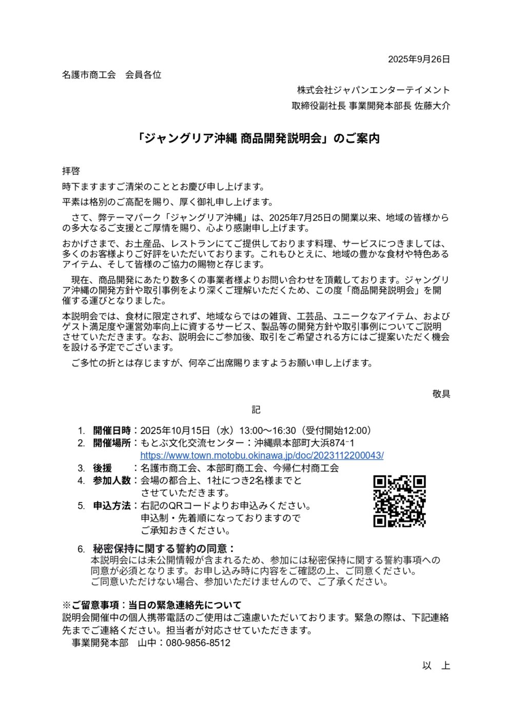 10月15日に本部町にて㈱ジャパンエンターテイメントがジャングリア沖縄における取引事業者との商品開発方針や取引事例を紹介する商品開発説明会を開催します。下記QRコードより申込ができます。関心のある事業所はぜひご参加ください。