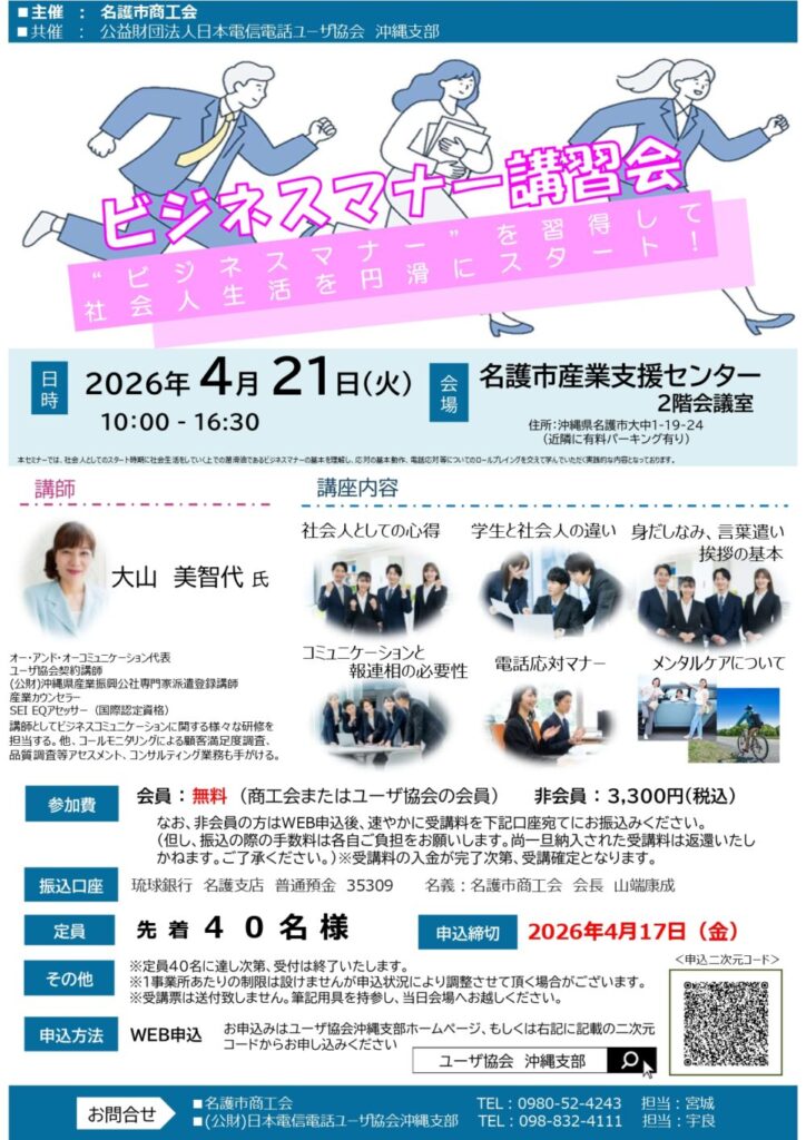 名護市商工会では、新入社員や若手社員の育成、基本的な接遇力向上を目的として「ビジネスマナー講習会」を開催します。